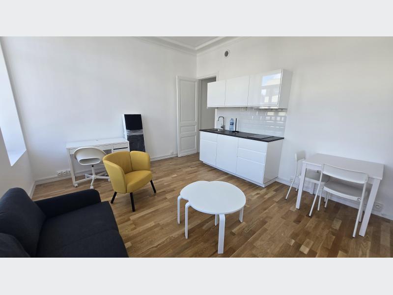 Ce T2 meublé de charme se compose de : Une pièce de vie lumineuse avec parquet, espace salon/bureau et coin repas.